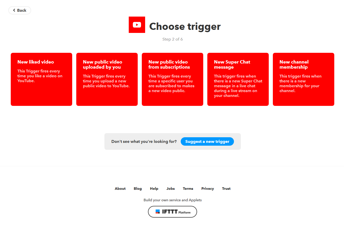 - بعد القيام بما سبق بشكل صحيح، عليك اختيار العامل الأول الذي تحدثنا عنه. بالنسبة لليوتيوب هناك خمسة عوامل أولى “أسباب” يمكنك اختيار واحد منها. العوامل الخمسة هي “عندما تضع إعجاب لمقطع فيديو”، و “عندما تقوم بتحميل فيديو عام جديد إلى يوتيوب”، و “عندما ينشر مستخدم معين اشتركت بقناته مقطعا جديدا”، و “عندما تردك رسالة جديدة في الدردشة المباشرة أثناء بث مباشر على قناتك”، وأخيرا “عندما يقوم أحدهم بالاشتراك بقناتك”.
